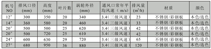 1、特點: ①環(huán)保:無須電力,連續(xù)運轉(zhuǎn)高效節(jié)能,無噪音、無火花、具防爆性。 ②防風(fēng)雨特性:圓弧形葉片,每一葉片與葉片之間有空隙,旋轉(zhuǎn)時葉片互相補位把這此空隙填補,大量雨水延著圓的節(jié)線拋出,小量雨水則 延著葉和片流落屋頂,不會流入渦輪里,同時旋轉(zhuǎn)的渦輪使空氣由葉片間隙流出,阻擋雨水進入。 ③運轉(zhuǎn)裝置:采用高技術(shù)水準的滾珠軸承,這種軸承是完全封閉,而且永遠自我潤滑,使它能在低于 3.2Km 時速的微風(fēng)下轉(zhuǎn)動。 ④防塵:渦輪排風(fēng)機是24小時不停轉(zhuǎn),灰塵不易附著,即使需清洗也很方便。 ⑤維修費:旋轉(zhuǎn)式排風(fēng)排氣不需維修,也不需要更換零件,提供絕對優(yōu)良品質(zhì),因此選擇無電機渦輪風(fēng)機是投資者最佳的保障。 ⑥重量輕盈:渦輪排氣安裝于屋頂上連底座一并算總重量約 15Kg /座,相當輕盈,在設(shè)計鋼結(jié)構(gòu)荷重時,可以不需考慮。 ⑦采光:葉片與葉片之間有空隙光線會由此進入室內(nèi),可增加照明度5-10%節(jié)省電費。 ⑧壽命:一般使用壽命在15年以上。 2、應(yīng)用 ①產(chǎn)生空氣對流、排散熱所。 ②減低室內(nèi)溫度、增加室內(nèi)新鮮空所。 ③減低空調(diào)負荷、增加制冷效果。 ④抽出屋頂濕氣、霉氣、蒸所、保持樓頂干爽。 ⑤代替重 型電排風(fēng)機,減低支架成本,節(jié)省電費,減掉噪音。 ⑥適用于工廠、倉庫、大廈天臺、別墅、天井、花房、禽畜養(yǎng)殖、礦山坑道及一切房頂?shù)耐?、換氣。