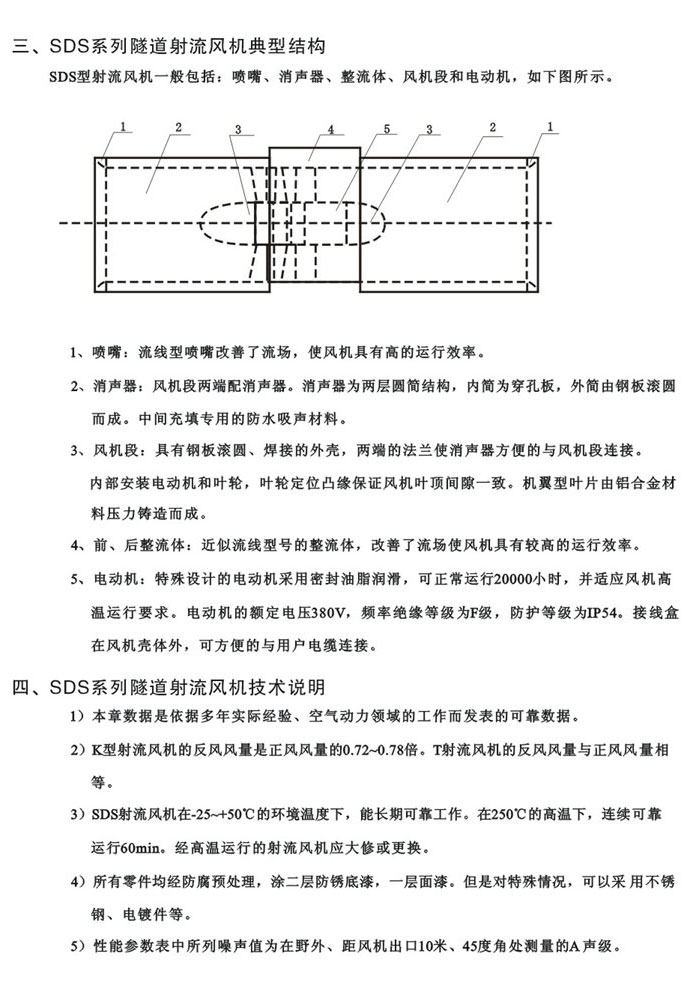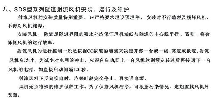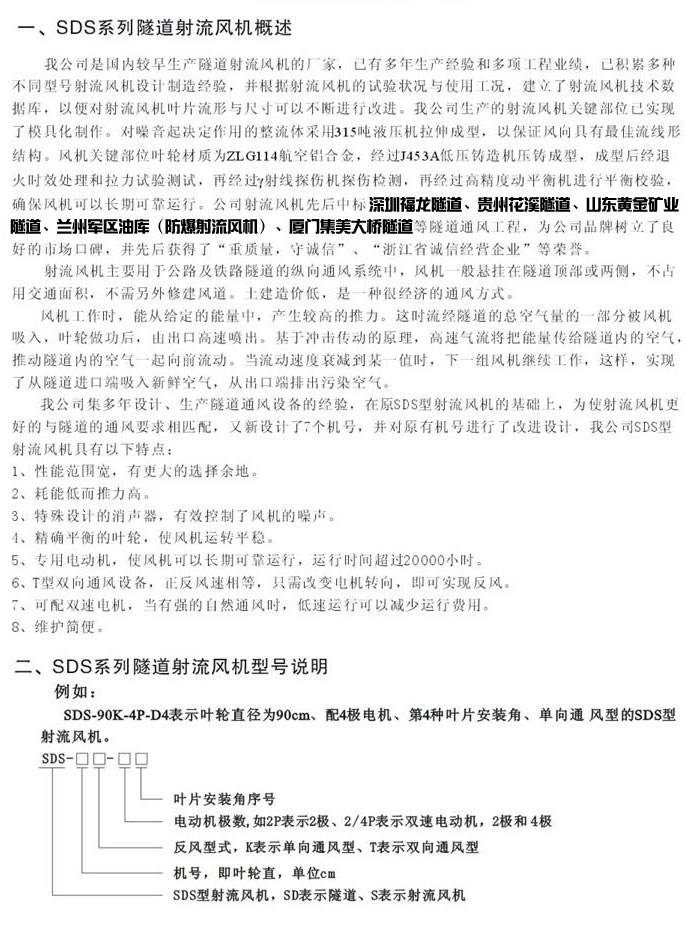供應(yīng)SDS-D/S隧道射流風機參數(shù),廣泛應(yīng)用隧道、地鐵、礦山等工程的專用通風,通常懸掛在隧道頂部,利用隧道本身作為風道。風機型經(jīng)過CAD優(yōu)化設(shè)計,電機采用專門設(shè)計,進出風 兩端加消聲段,故使風機運行時具有推力高且氣動噪聲低。